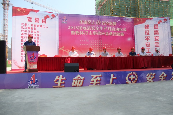 在现场活动中,定远项目公司副总工程师傅吉祥发言表示,将按照省委省政府关于“2018年安徽省安全生产月和安全生产江淮行活动方案”的工作决策部署,突出“生命至上、安全发展”主题,围绕推进安全生产“铸安”行动常态化实效化和“六项机制”制度化规范化,严格监督管理,明确责任、落实责任,创新活动形式,通过开展宣教活动,进一步树立红线意识,加强安全法治宣传,落实安全主体责任,普及安全知识,全面提升员工安全素质,确保安全生产局面的持续稳定,为建设大爱定远、大美定远而奋斗。
